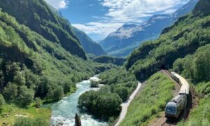 Die Flambahn gehört zu den größten Attraktionen des nordeuropäischen Eisenbahnnetzes und führt von tiefblauen Aurlandsfjord in eine beeindruckende Gebirgslandschaft mit dem mächtigen Wasserfall Kjosfossen.