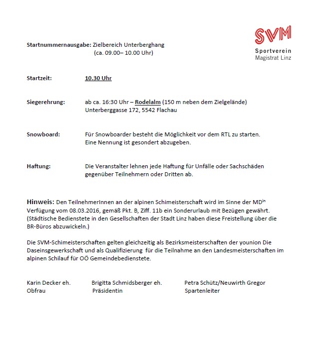 Anmeldung / Nennung bis 7. Februar an Petra Schütz unter: mailto:petra.schuetz@mag.linz.at oder telefonisch im Büro der Personalvertretung unter 7070/1052.
