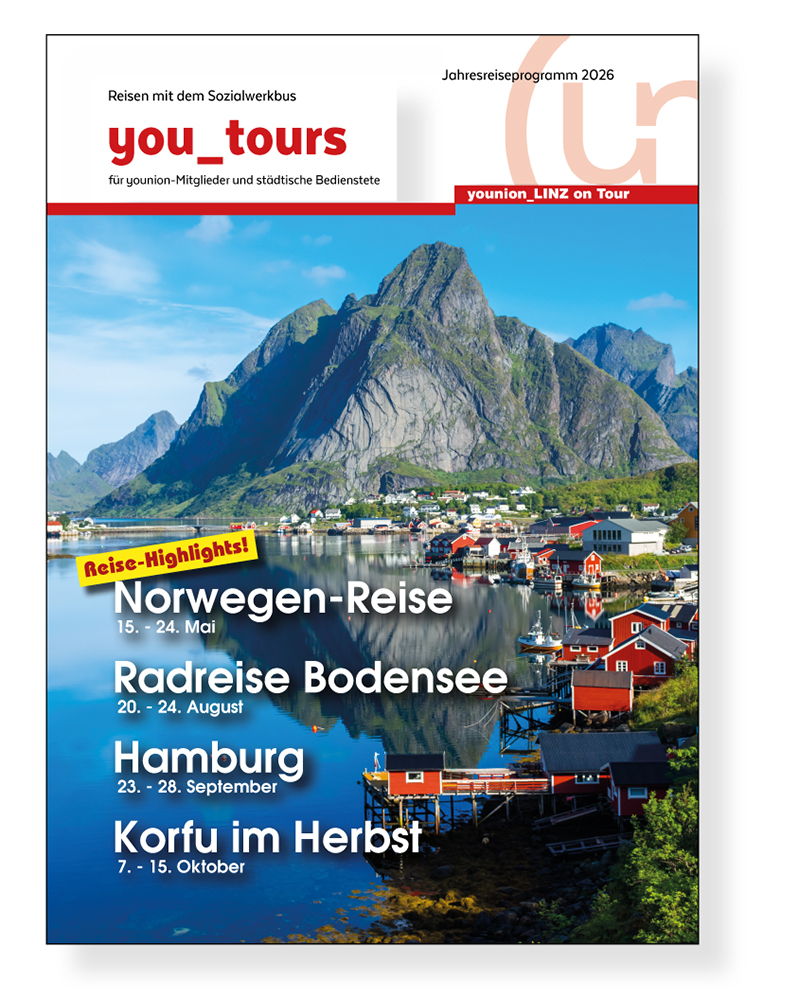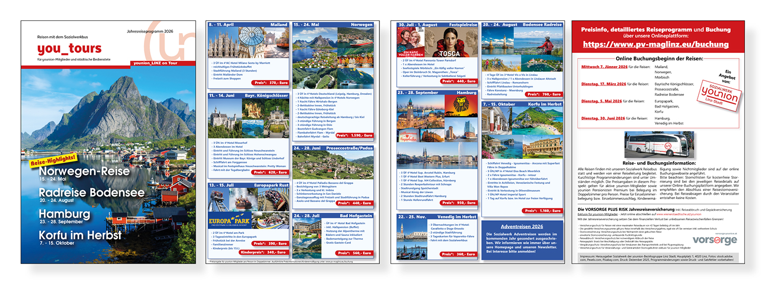 das neue Jahres-Reiseprogramm 2026 des younion Sozialwerks ist fertiggestellt. Wir hoffen es sind wieder zahlreiche Reisen für euch dabei.